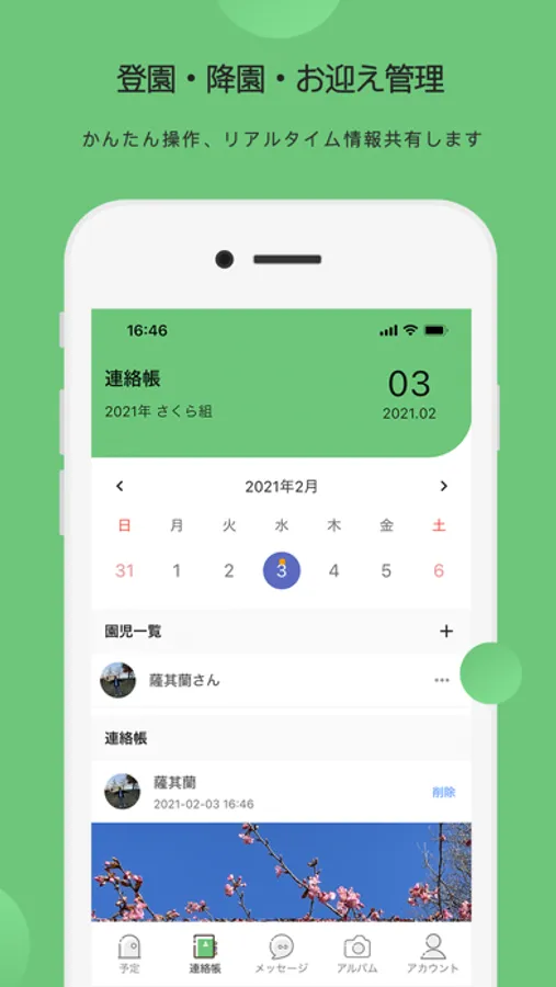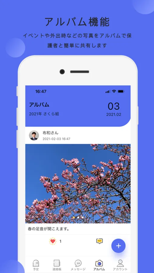 写真アルバム機能を提供しており、子供が園内で過ごしている様子、毎日の散歩中の出来事やイベントを過ごす子供の写真がアルバムにまとめられたものを確認することができます。