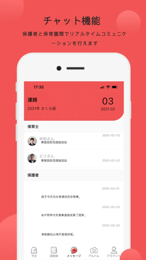 リアルタイムで保育士とメッセージのやりとりをすることができるため、急な予定の変更や電車の遅延、災害時にも連絡を取り合うことができます。