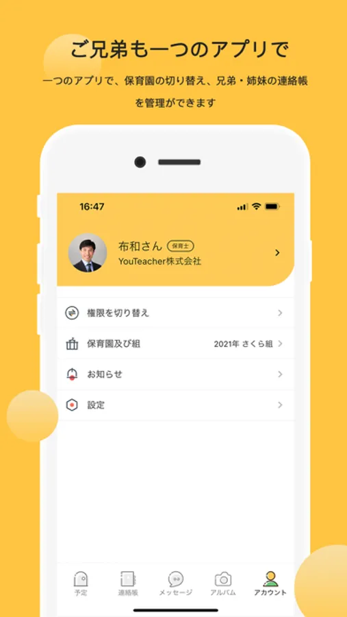 1つのアプリで、保育園の切り替え、兄弟・姉妹の連絡帳を管理ができます。複数冊の連絡帳を持つ必要はありません。組み単位で情報が管理されており、混沌どしません。卒業しても過去の記録が見れ、思い出になります。