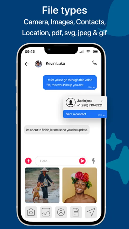* Share any type of documents, contacts, voice mails, location, images and videos.