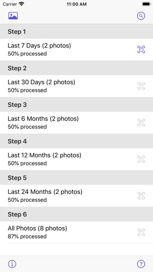 You can scan a selected time period (7 days, 30 days, 6 months etc.) or scan all your photos. Once a photo has been processed, you will not have to scan it again, so after a while you will have processed your complete photos library and it will be ready to be searched instantaneously.