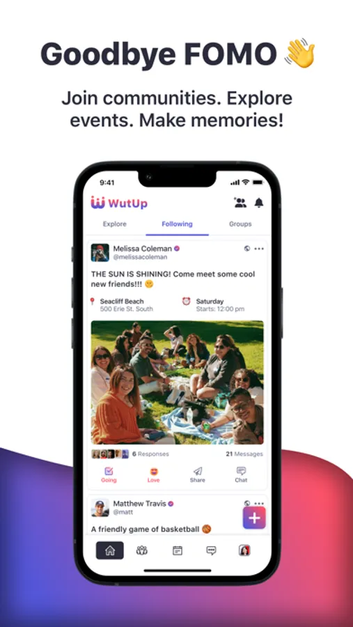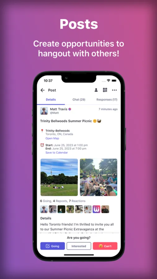 GROUP MESSAGING: Engage in real-time conversations through two types of group chats: Post-Based Chats, which are automatically generated for each new post and allow you to discuss details, and plans, or socialize with others that are going; and Community Chats, which are created when you join or establish a community and are ideal for ongoing discussions and activity planning.