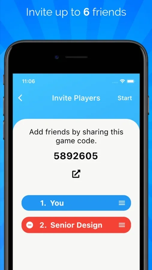 Here you’ll see your game code. Share this code with anyone you’d like to join your game. When users are added they are automatically assigned to a team. You can change teams by holding down on the selected player and moving it to the desired location. When you’re ready to start the game, click start.
