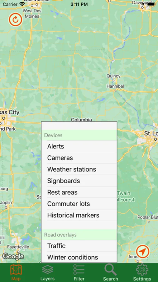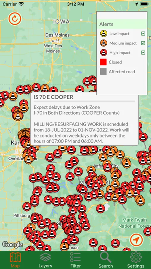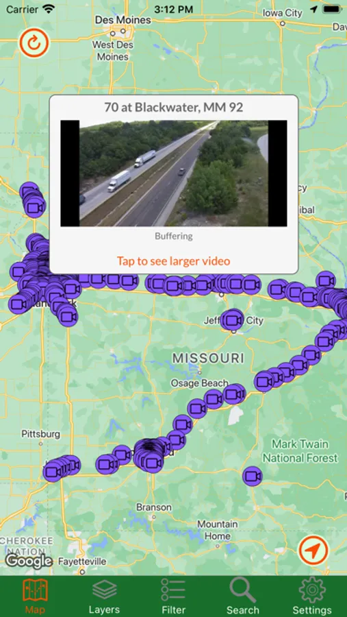 Missouri Traveler shows you the current status of major roads and highways throughout the entire state. By accessing the state's road data, you can view traffic cameras, read alerts about construction and other road-related issues, get stats from weather stations, and read roadside signboard messages. You can view road overlays that tell you the current speed or weather-related driving conditions. Also available is Google Traffic, just so you have all the data in one app. For in-app purchases, you can read all those historical markers without getting out of your car!