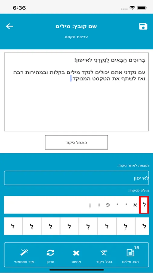 עם נקדני אתם יכולים לנקד טקסט בעברית ואז לשתף אותו דרך האפליקציה.