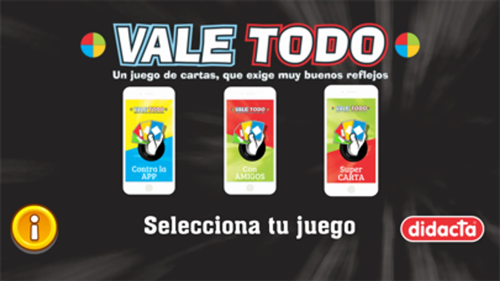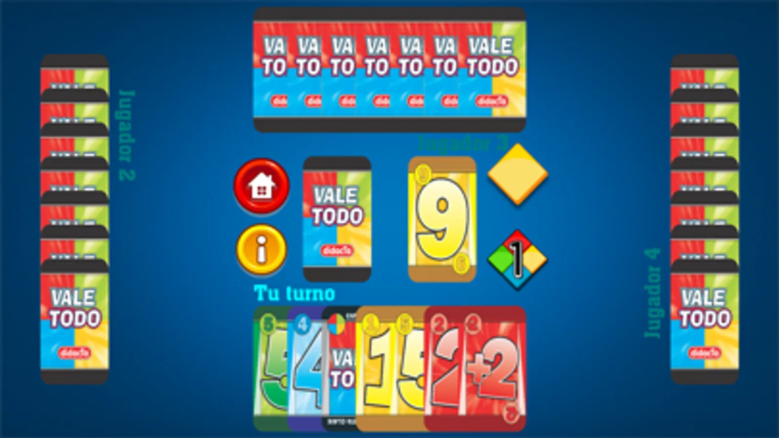En este juego gana quien se libra primero de todas sus cartas. Para descartar es necesario que tu carta tenga el mismo número o el mismo color de la carta anterior. Existen también las cartas especiales que tú puedes utilizar para confundir a los otros jugadores y dejarlos con las manos llenas de cartas. Piensa rápido, descarta correctamente y recibe ayuda con la opción de la Súper Carta en la APP (tienes hasta 3 veces por partida para utilizar esta opción). Vale todo es así, un juego rápido que garantiza la máxima diversión.
