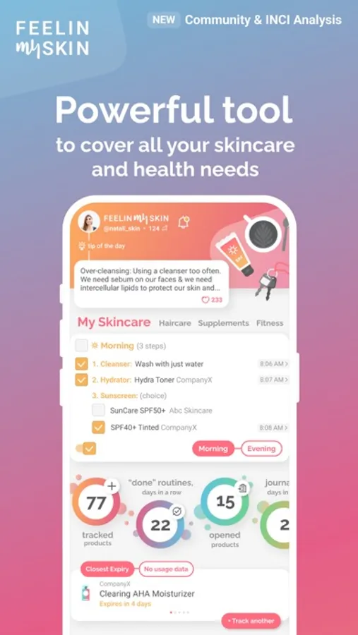 Feelin My Skin - the skincare app your skin deserves: create routines to stay consistent, track product usage, expirations & skin changes, learn skincare tips & ingredients purposes.