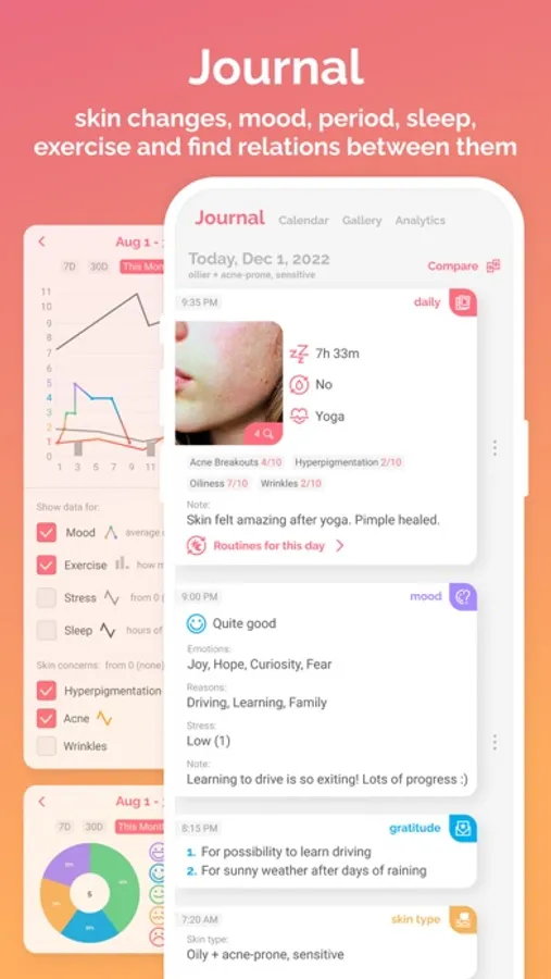 - Start journaling to track all the skin changes, photos and explore the relations between your skin and other lifestyle metrics.