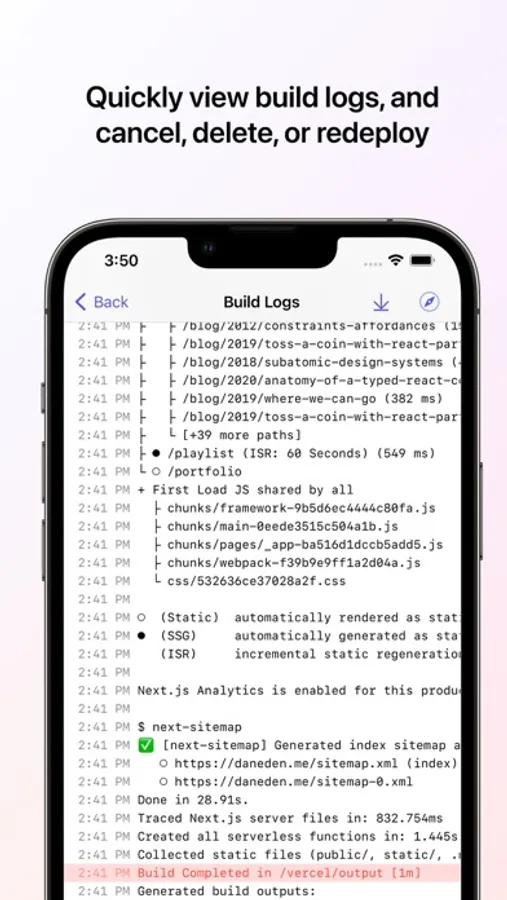 See deployments wait, build, and finish (or fail); quickly access their URLs, logs, or commits; and get real-time notifications for build progress.