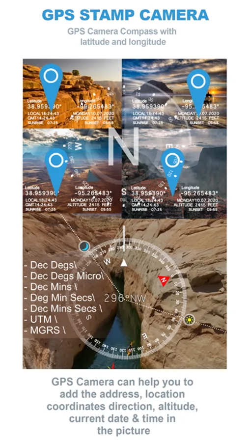 GPS Camera can help you to add the address, location coordinates direction, altitude, current date & time & note in the picture.There is a coordinate converter to switch between any of the common coordinate systems including Lat/Long, UTM, and MGRS so it can work with any physical map.