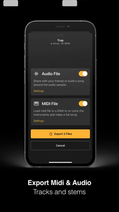 Once you are ready with your song you can export it as a midi file and keep working on it in your DAW. You can also export audio files and share them on social media or to your artist, producer or a friend instantly.