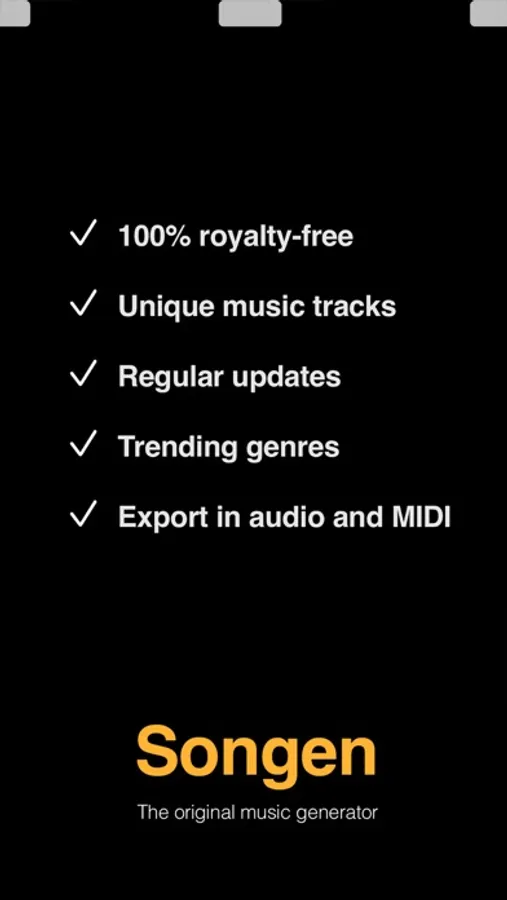 With a just a tap of the Generate button Songen creates totally unique songs. Just a few more clicks and you have a whole song that is completely owned by you.
