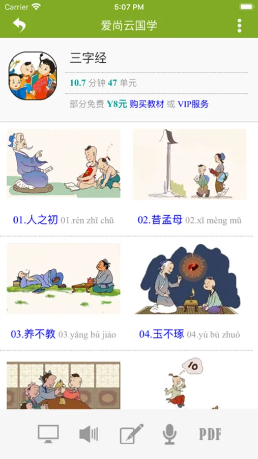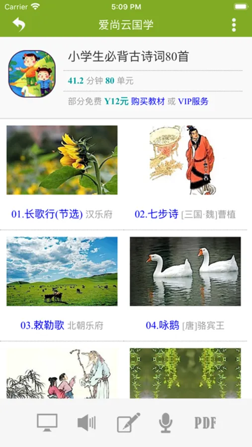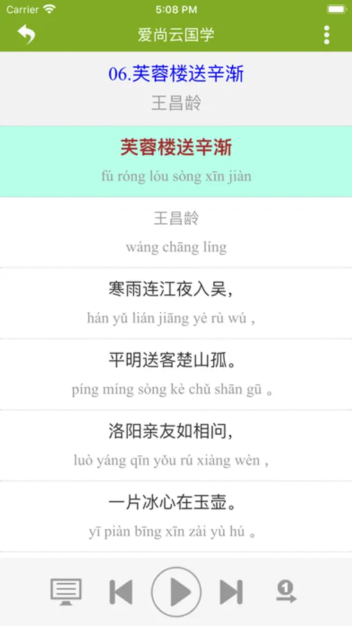 “读千年美文,做少年君子”。中华民族传统文化源远流长,众多国学经典凝聚了我国五千年文明,体现了中华民族博大精深文化的精髓。不仅是我国传统文化中的一颗璀璨的明珠,也是人类文化史上最珍贵的遗产之一。经典篇章,行文流畅,气势磅礴,辞藻华丽,朗朗上口;内容丰富,古往今来,无数学生从中汲取知识,陶冶情操,提高修养。爱尚云国学提供的不仅是一本本精美的有声诗集,更是学习中华国学的好帮手。吃饭时、睡觉前,不用盯着屏幕,诗词连读,听久了自然印象深刻;空闲时,对对诗句,试试拼音,看看难字,练一练总会有所发现,测一测看看会了多少。
