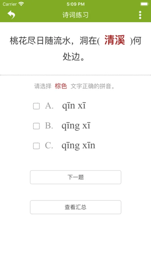 *练一练,每篇诗文提供3~10道练习题(对诗句、难字填空、拼音选择等)。练一练提供练习记录和错题集。
