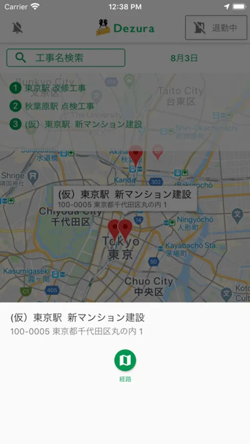 ・地図上の出勤する場所をタップして、チェックイン(出勤)