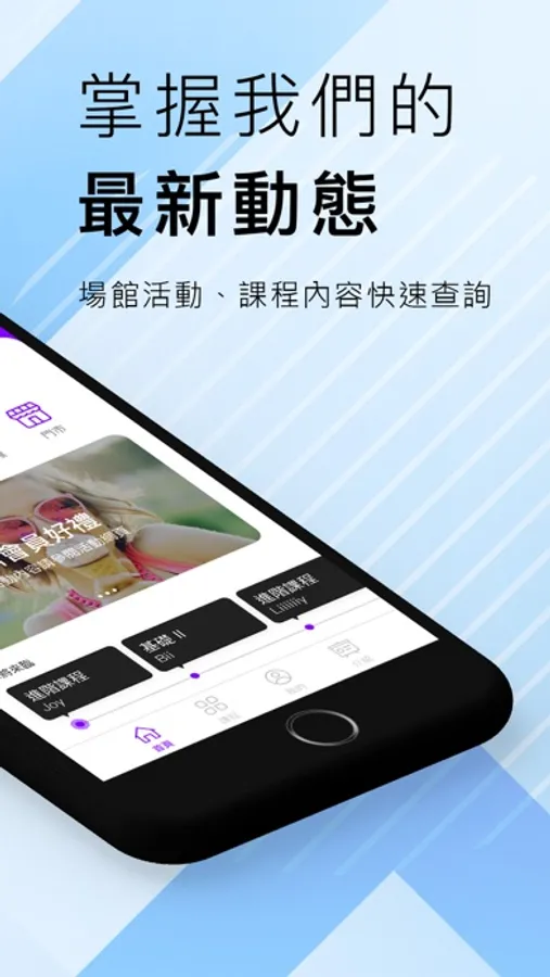 - 多元化課程 : Zumba/X55超能55/OX活氧舒展/瑜伽輪/長軸滾筒/減重專班/芳香療癒/PiYo全方位雕塑