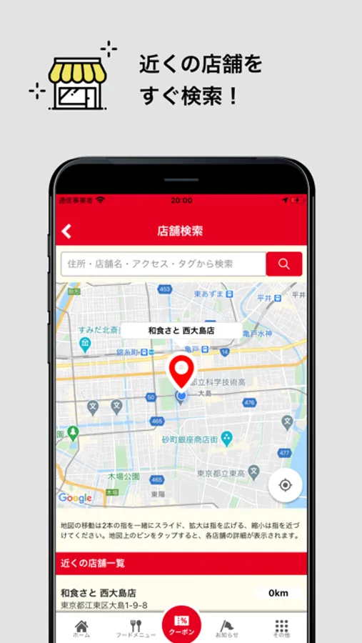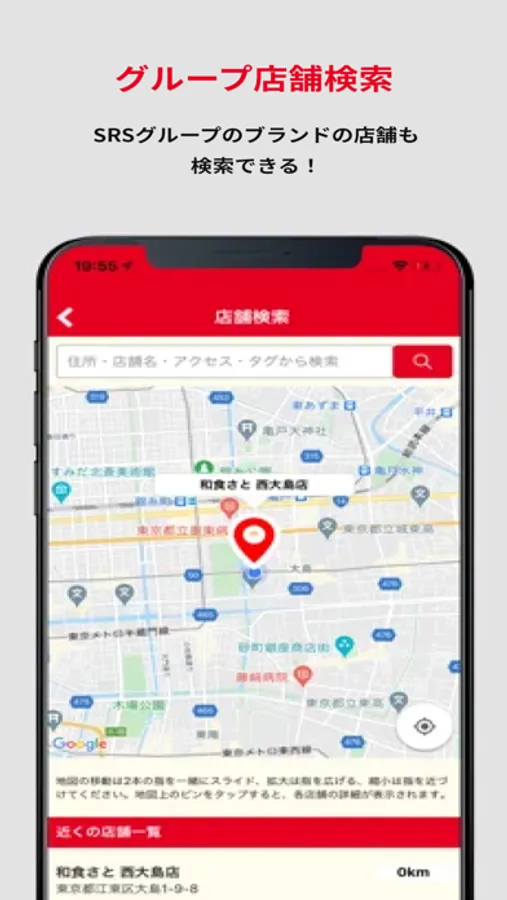 お近くの店舗や、特定の条件に合った店舗の検索が可能です。