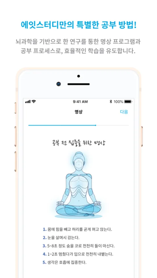 - 에잇스터디는 뇌과학을 기반으로 한 연구를 통해 최적의 집중력을 만들 수 있는 명상 프로그램을 개발해, 학습 시간 동안 사용자의 주의 집중력을 담당하는 전두엽을 활성화하여 최적의 집중력을 유지할 수 있도록 도와줍니다.