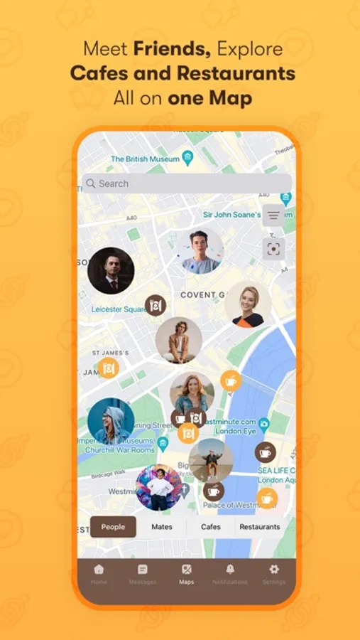 community through the maps page and see updates from cafes and friends from