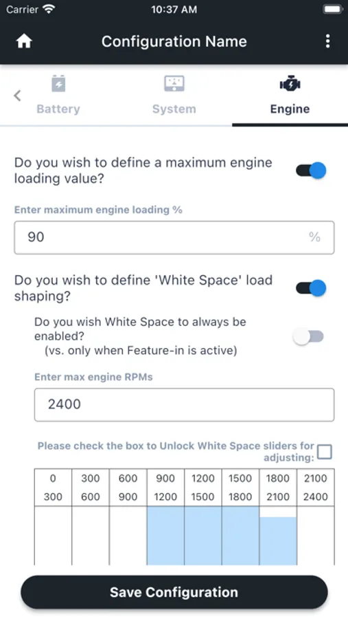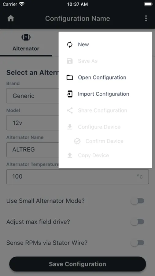 Once you have created your configuration it may be saved for later retrieval, shared via the built in 'share' tools (Email, messaging, etc), or sent to your WS500 Alternator Regulator. To program your WS500 regulator 'share' your configuration with a Windows based PC and use the Wakespeed "Universal Configuration Utility" (downloadable at http://www.wakespeed.com/technical ) and a USB cable. This can even be done before the WS500 is installed. Alternatively you can share the configuration to an Android based phone for direct transfer.
