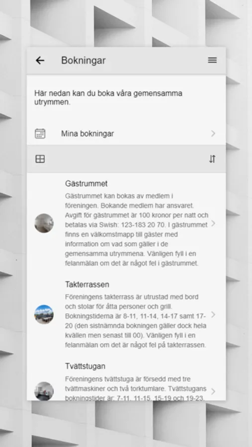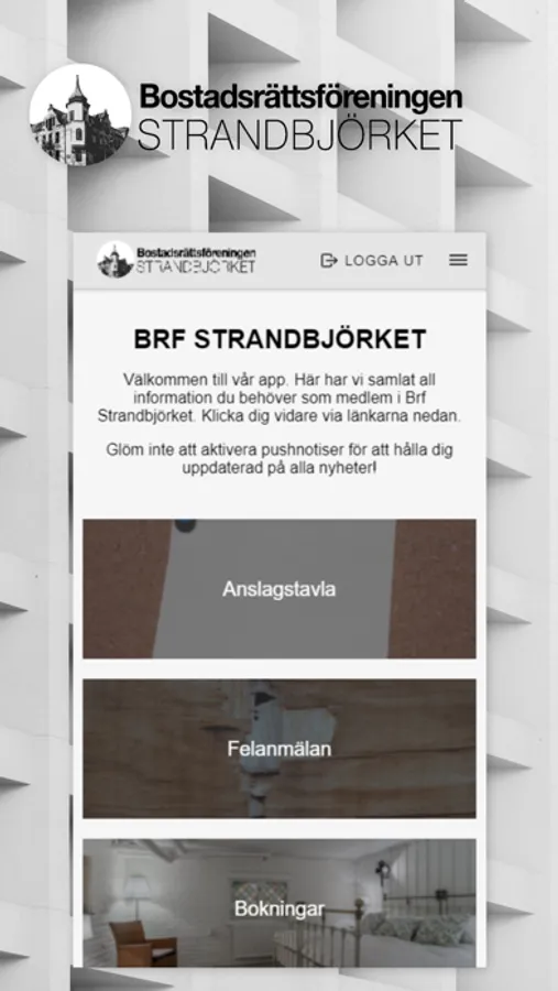 Bostadsrättsföreningen Strandbjörket i Växjö är modern och digital, även om huset vi bor i är från förra sekelskiftet. Vår app underlättar medlemmarnas vardag och samlar all information på en plats. Här går det – när som helst, var som helst – att boka tvättstuga, gästrum eller takterrass; läsa meddelanden från styrelsen eller skriva egna på anslagstavlan; och skicka felanmälan. Stadgar, andra regler och styrelsens protokoll finns även samlade här.