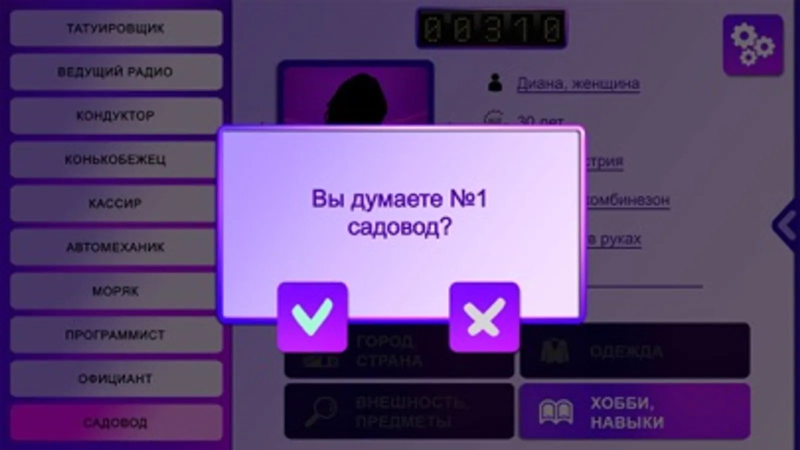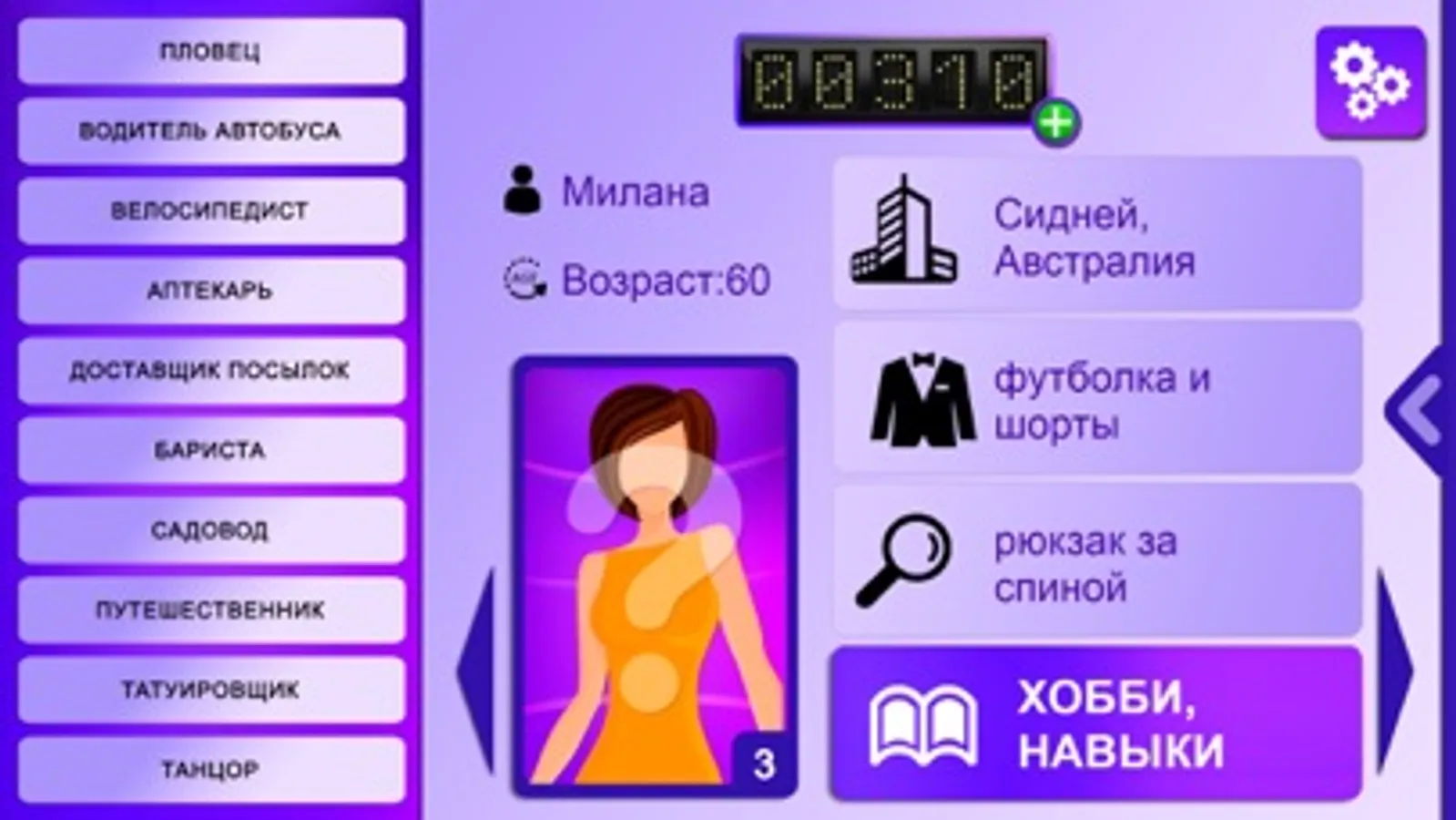 Перед игроком на подиуме находится 9 персонажей. Ему нужно угадать кто они по профессии. Предлагается 10 вариантов профессий. По каждому персонажу всегда доступна основная информация: имя, пол и возраст. В начале игры игроку дается 400 баллов. За них можно открывать дополнительные подсказки. Для открытия города и страны нужно потратить 20 баллов, узнать во что одет 30 баллов, внешность и предметы персонажа – 40 баллов и если вы захотите узнать хобби и навыки, то придется потратить 50 баллов. Также, есть возможность открыть любую из подсказок за просмотр рекламы и сохранить свои баллы. Игрок сопоставляет открытые признаки и выбирает профессию, которая по мнению игрока соответствует этому персонажу. В случае верной догадки персонаж уходит из игры и угаданная профессия исчезает из списка, а если догадка неправильная, то силуэт персонажа гаснет, а профессия остается. По окончанию раунда за каждого правильно отгаданного персонажа игрок получит по 50 баллов. Сделав три ошибки в своем выборе игрок проигрывает. Сколько будет раундов зависит от вашей интуиции, если всегда правильно угадывать всех персонажей, то их будет 11.