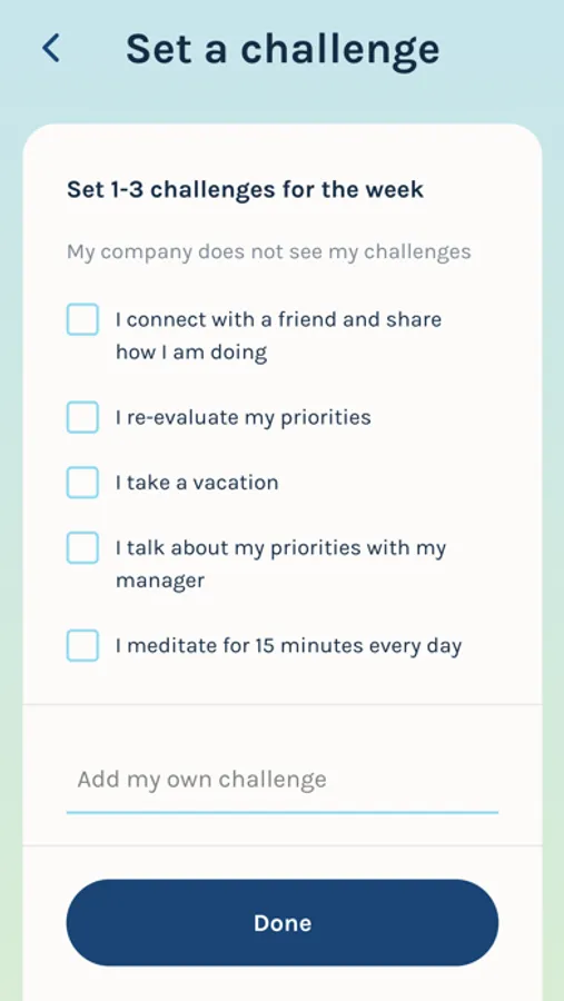 On Day 5 get a detailed overview of your wellbeing. Set personalised challenges to reduce your stress and explore strategies that could help. If necessary, schedule another quiz in a month to track your progress.