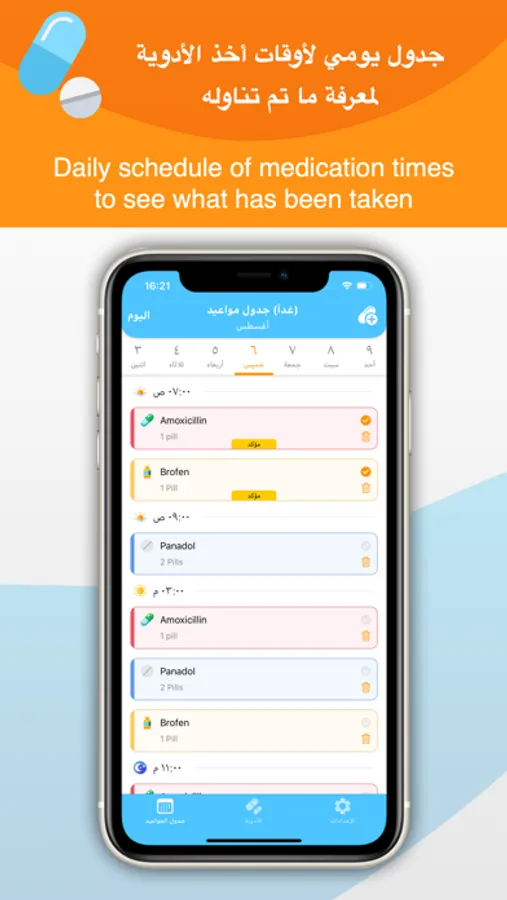 - يمكنك الاطلاع على جدول الأدوية التي عليك أخذها خلال اليوم المختار