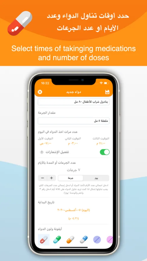 - يمكنك تحديد أوقات أخذ الدواء خلال اليوم