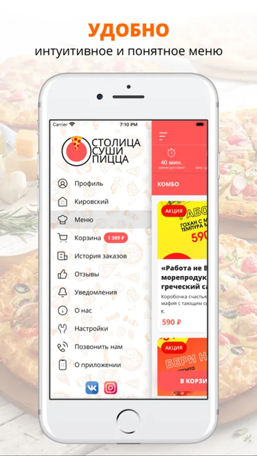Пицца, суши, роллы на дом и в офис до 60 мин.