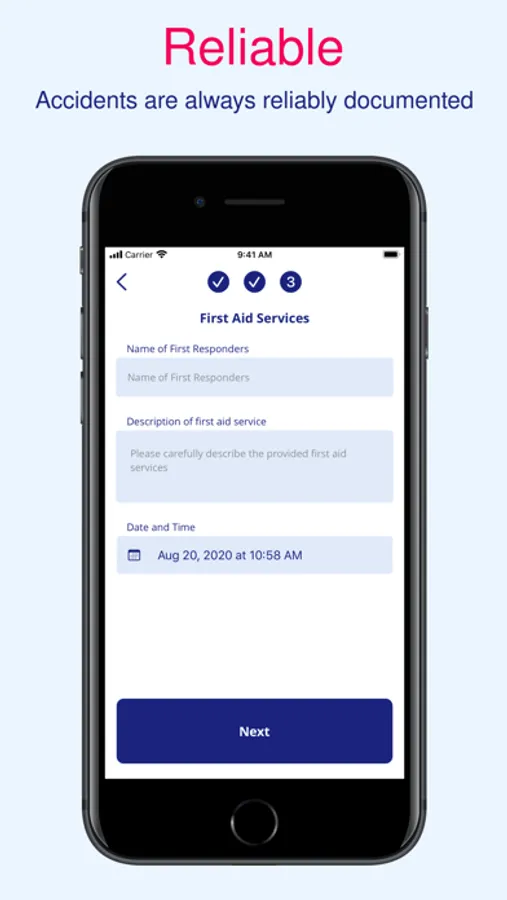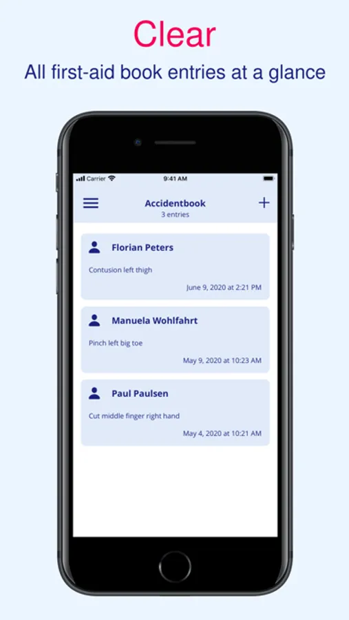 The first aid manual app enables your company to document first aid and accidents reliably and quickly. The software is very intuitive to use, so that even if you use it infrequently, no familiarization is necessary. This, and the fact that every employee can have the first-aid manual on his or her mobile phone and thus in his or her trouser pocket, means that even minor injuries are reliably recorded. Illegible entries are no longer a problem. In the case of incomplete entries, the user can be asked to make additions. Analyses can also be easily carried out, as it is no longer necessary to collect, decipher and digitalise dozens of dressing manuals individually. A rights and role concept guarantees that only users with administrator status have access to all entries. Thus, the protection of employee data can be guaranteed much better than is the case with a conventional first-aid manual.