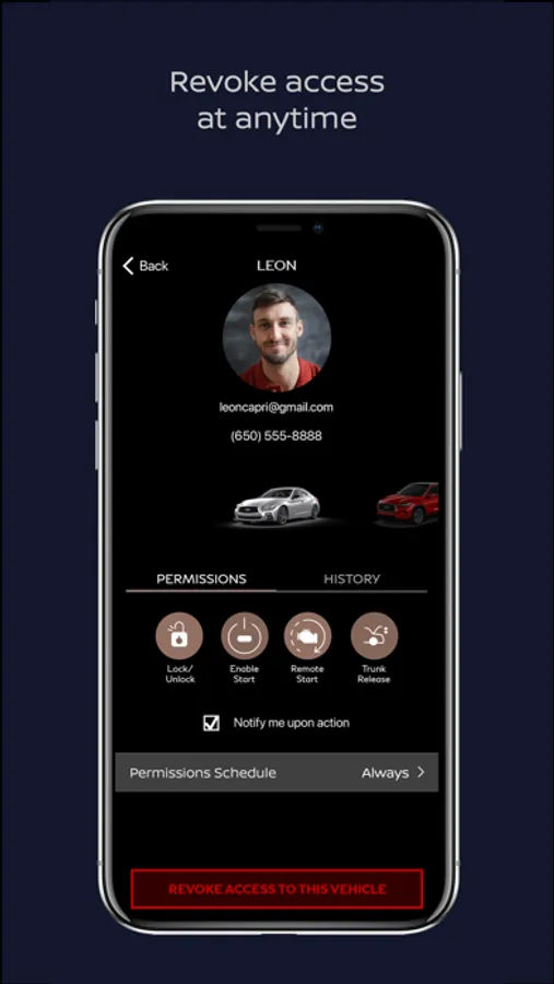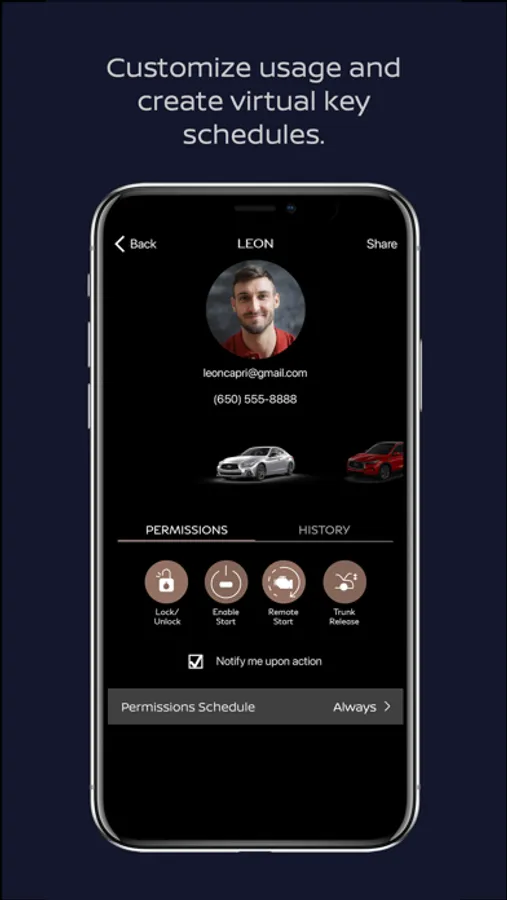 When you want to give someone access to your vehicle, easily create and send them a Virtual Key. Once the invite is accepted, they will be able to use the Infiniti Virtual Key app to access and control your vehicle based on the permissions and time period you’ve allowed. You can also revoke access from within the app. You can share up to 7 Virtual Keys.