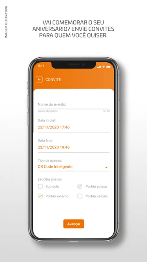 Possibilidade de o morador criar um evento e enviar convites para todos os seus convidados. Sempre que um dos seus convidado entrar ao condomínio, ele recebe uma notificação push no app.