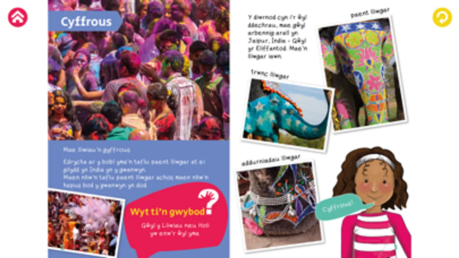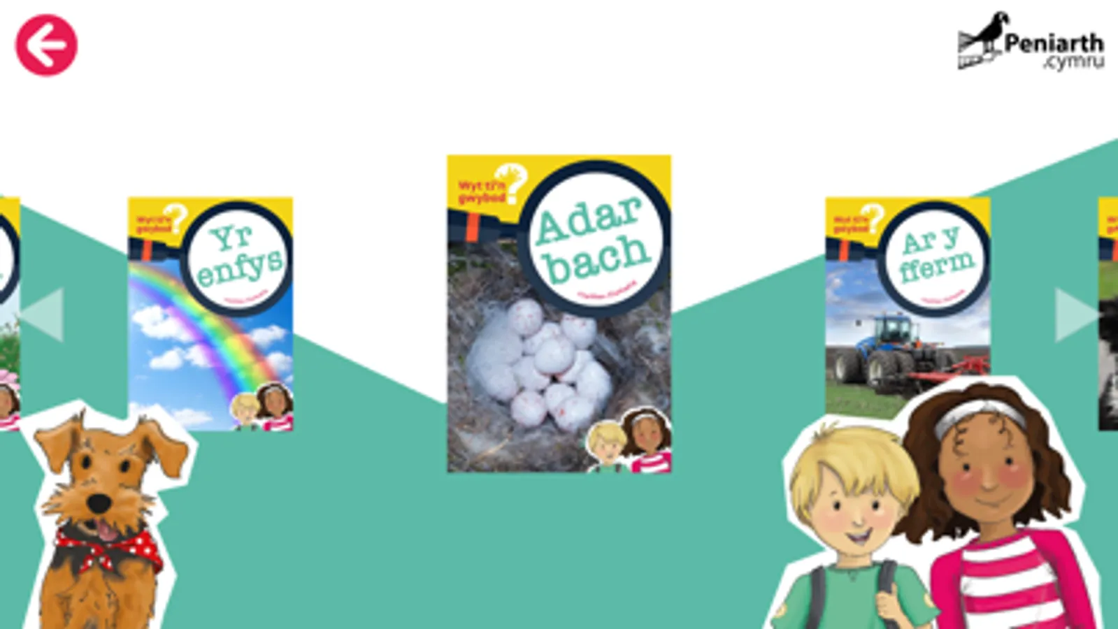 The Wyt ti'n gwybod app serves as a companion to the book series of the same name. Within this app you can read each of the 30 books available, with 15 books contained in each of the app's two levels. As a guide, the yellow level contains books for 3 - 5 year olds, and the red level contains books for 5 - 7 year olds.