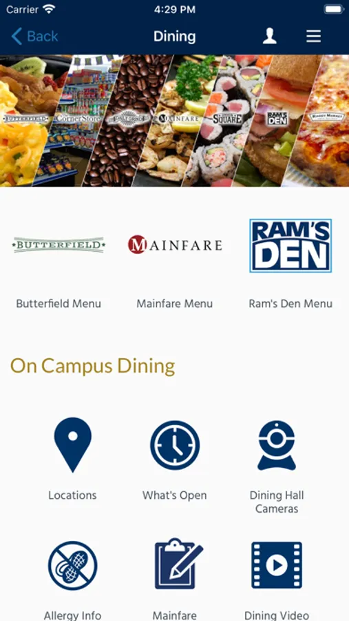 • Find out what’s being served in the dining halls and check the lines with the dining hall cameras