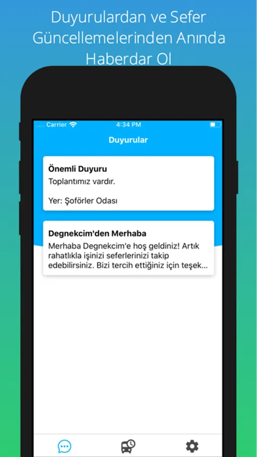 Eğer araç sahibi veya sürücü iseniz sefer saatlerinizi rahatlıkla görebilir, duyurulardan anında haberdar olabilirsiniz.
