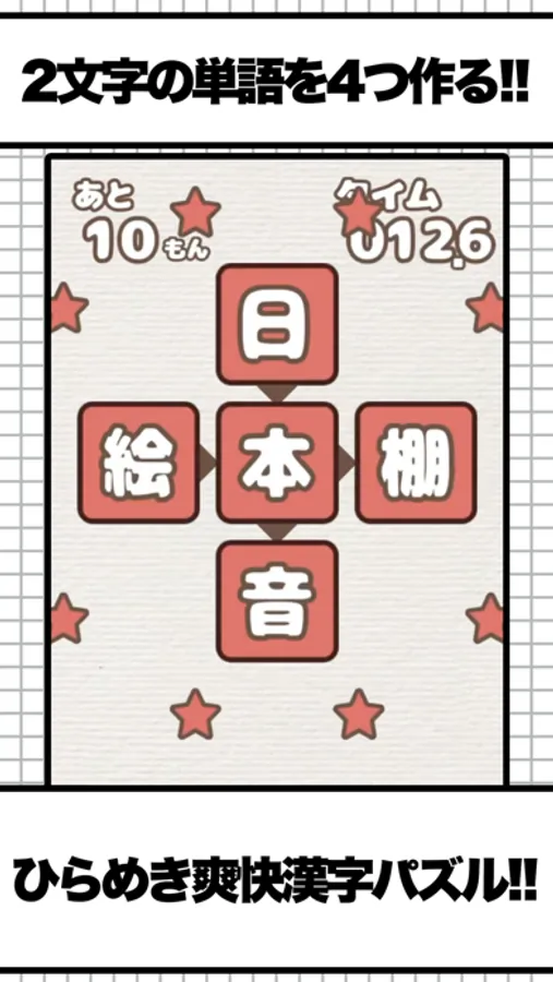 全部が穴埋めの漢字パズルです。5つの漢字の組み合わせを考えて、2文字の単語を4つ作ります。