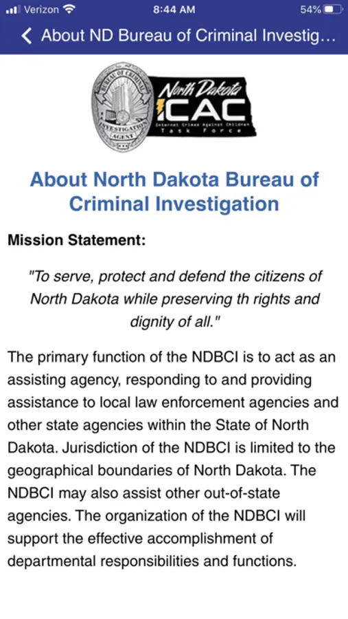The primary function of the NDBCI is to act as an assisting agency, responding to and providing assistance to local law enforcement agencies and other state agencies within the State of North Dakota. Jurisdiction of the NDBCI is limited to the geographical boundaries of North Dakota. The NDBCI may also assist other out-of-state agencies. The organization of the NDBCI will support the effective accomplishment of departmental responsibilities and functions.