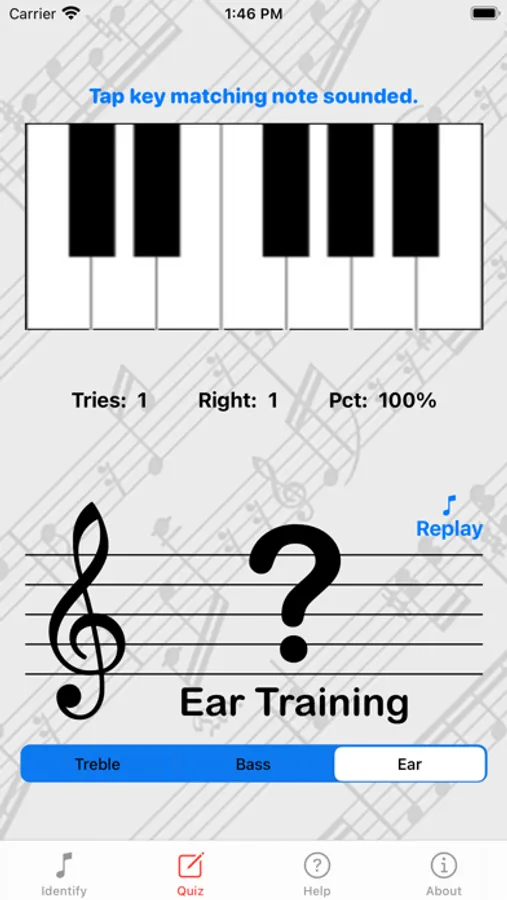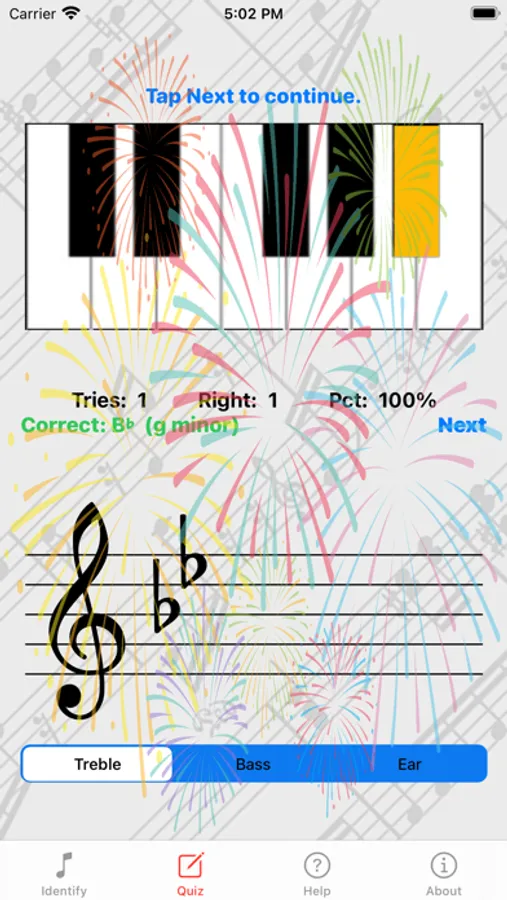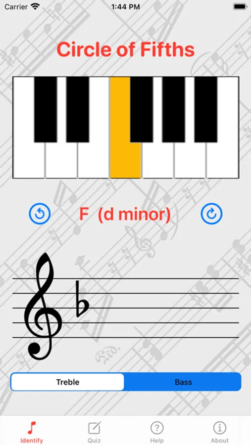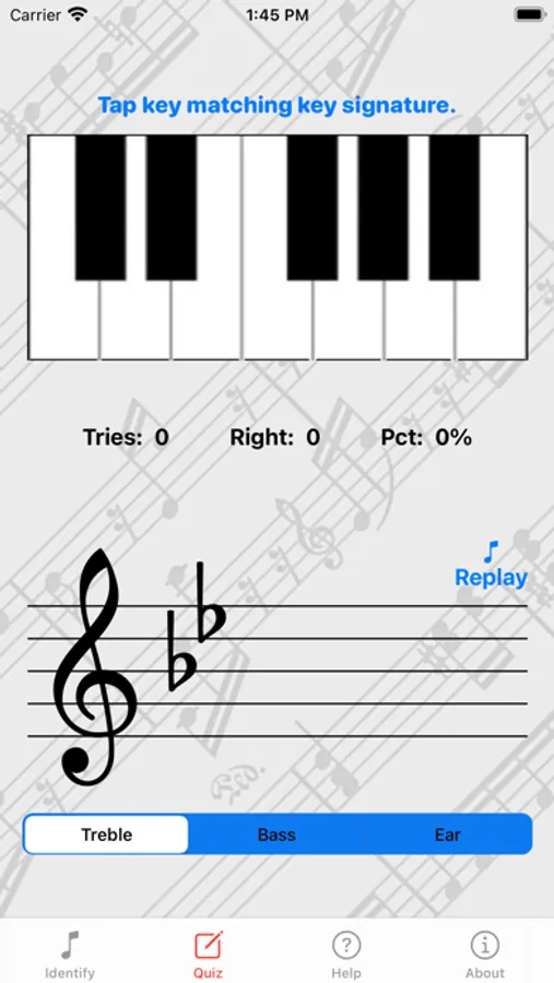 On the Quiz tab you can practice your key signature recognition for both treble and bass clefs. You can also practice note recognition with the Ear Training option.