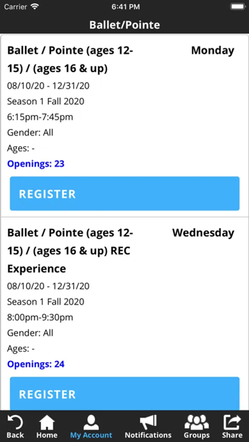 - You can check out what classes are offered by style, day, and times and choose to register on our app or you can come for a drop-in class.