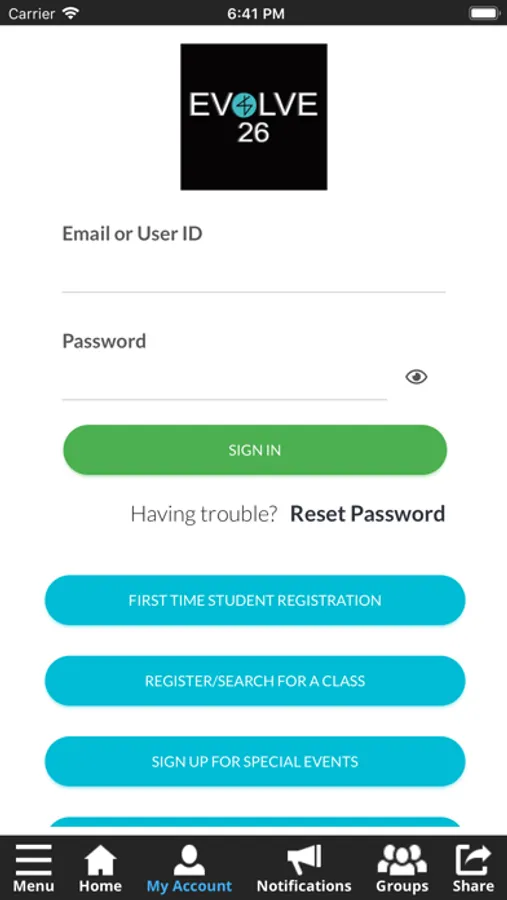 The Evolve 26 app allows you to register for classes, view our class schedules, and more. The Evolve 26 calendar, social media links, and contact information are also easily accessible from the app. You can also keep up with our studio pictures and videos on the Evolve 26 app.