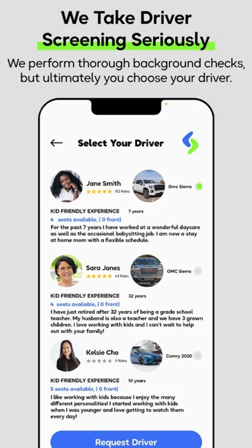 We put safety first through best-in-class driver screening. Drivers must be at least 21 years of age, have at least 5 years of caregiving experience, and pass a rigorous 15 point certification which includes local and federal background checks, DMV checks, stringent 25-point vehicle inspection, and an in-person interview.