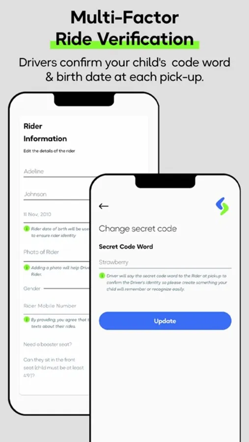 · Drivers will provide secret code words that you have included in your profile. Your child will be asked for their birth date, which the Driver will verify through your profile details.
