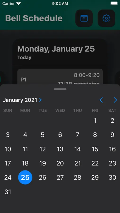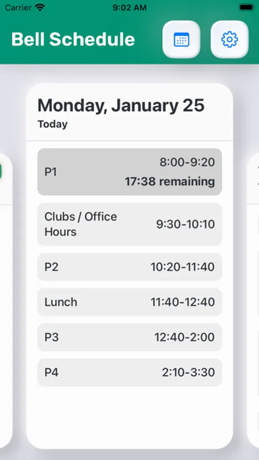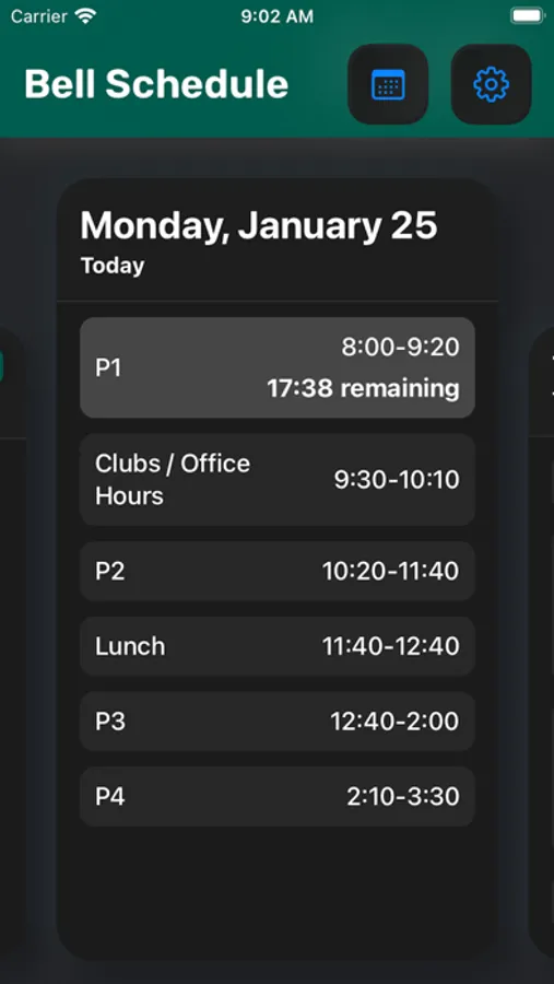 Check your school's bell schedule from your phone! See the time remaining in your current class and the time until your next one, all at a glance.
