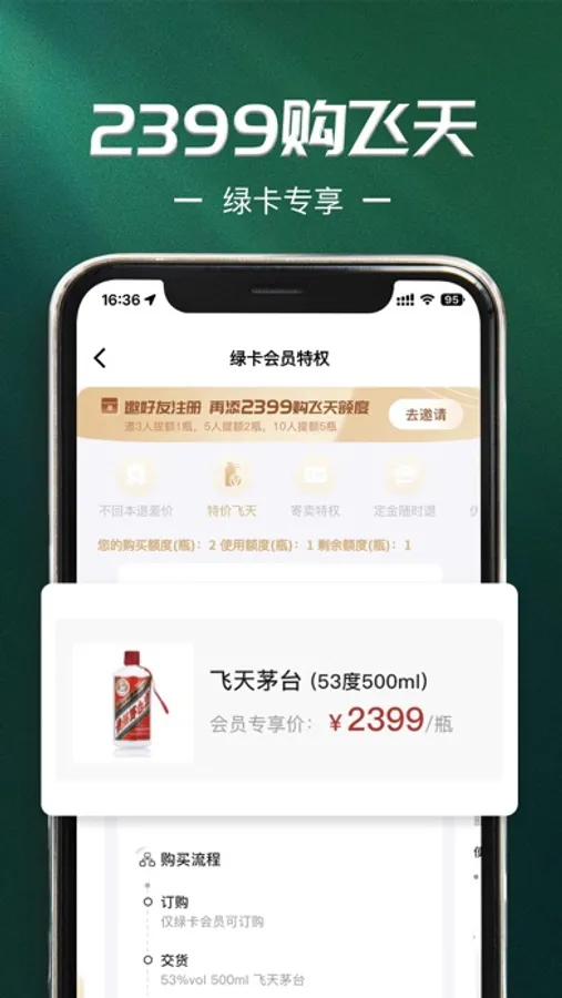 【绿卡专享】2399购飞天茅台,寄卖多赚7%,1299优惠券包随心领等12大特权。