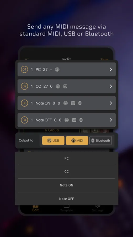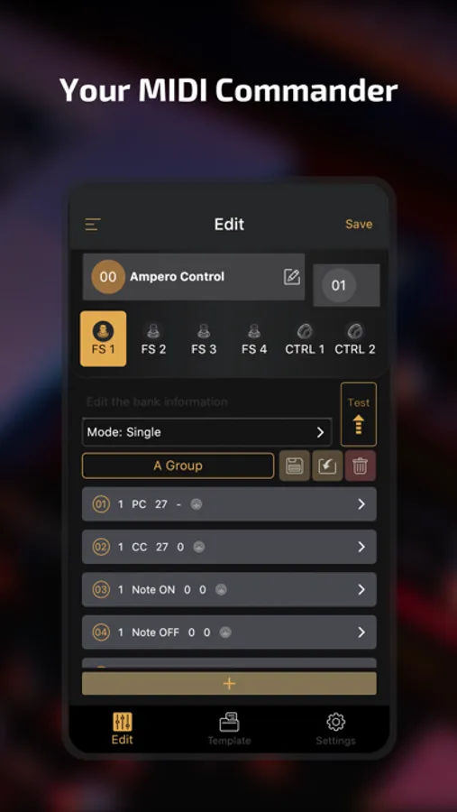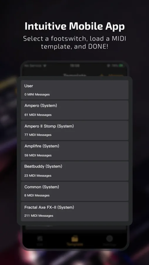 In the app we offer you several templates for you to achieve essential/advanced controlling of your musical gear: Select a footswitch, load a template and you’re ready to change presets, turn on/off effects, etc. You can also save your own templates and write notes on them.