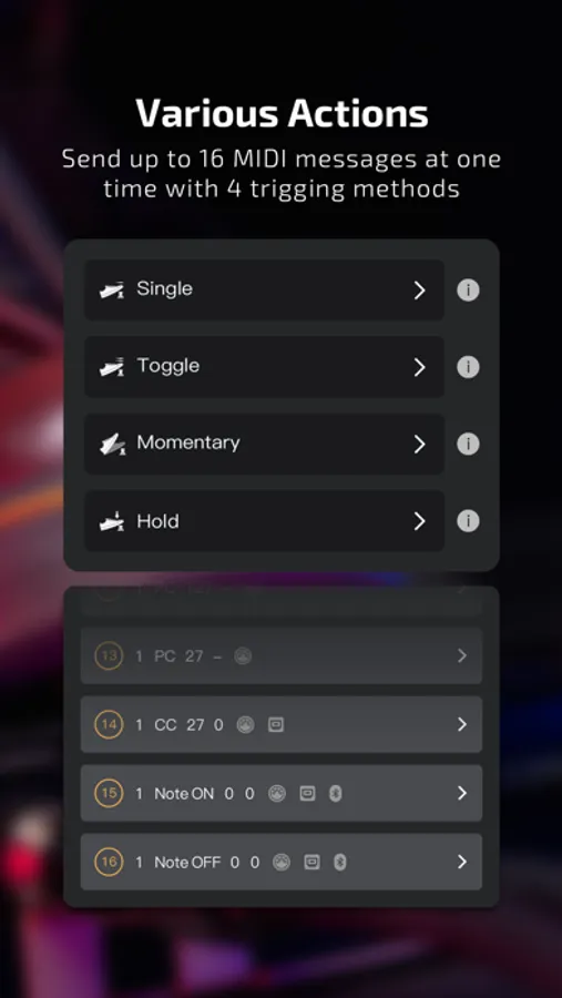 • Send max. 16 MIDI messages by one footswitch (32 for A/B groups)