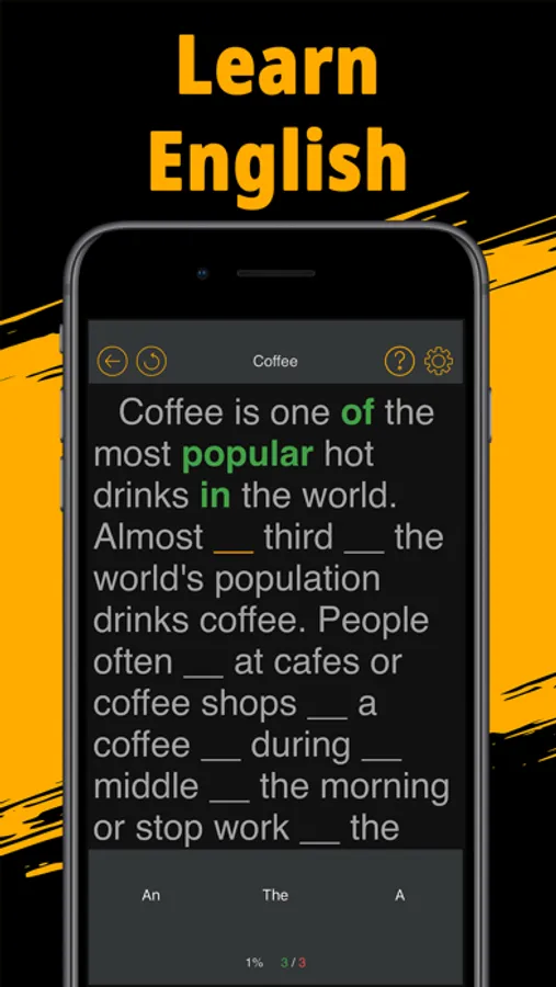 The principle of our application is to study the use of articles, prepositions, verbs, pronouns and adjectives with real examples. All examples are taken from the most famous books and articles. You just need to read the provided passage and insert the missing word in the desired form. Thanks to the clarity of the use of parts of speech, you will quickly understand the basic rules and learn how to use them in everyday life.