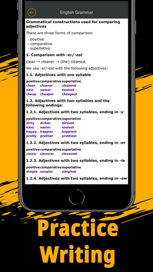 Our app contains all the information you need on English grammar. By leaving only the essentials, you will quickly learn the basics. This will help you avoid getting confused by the many rules and exceptions. Those who know English at a high level will be able to organize their knowledge. Also, you can constantly return to the application, which will help you maintain your knowledge at the proper level.