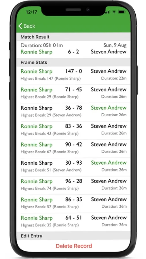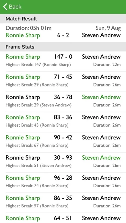 Every Match Result is saved and can be viewed in details which show time, score, highest break and duration of each frame in a Match. Match Results can be shared via Airdrop or other Convenient way with your friends who also use this App.